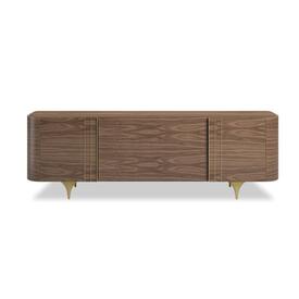 Legacy credenza embodies the signature curved shape of the collection through its porcelain or beveled marble top. The legs bestow a strong and elegant personality to the piece. The sideboard incorporates a hidden drawer with a cutlery tray to add functionality to any space.